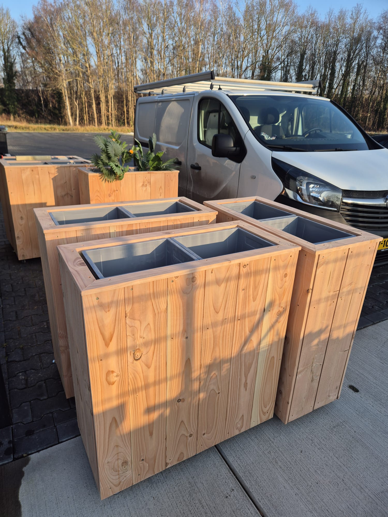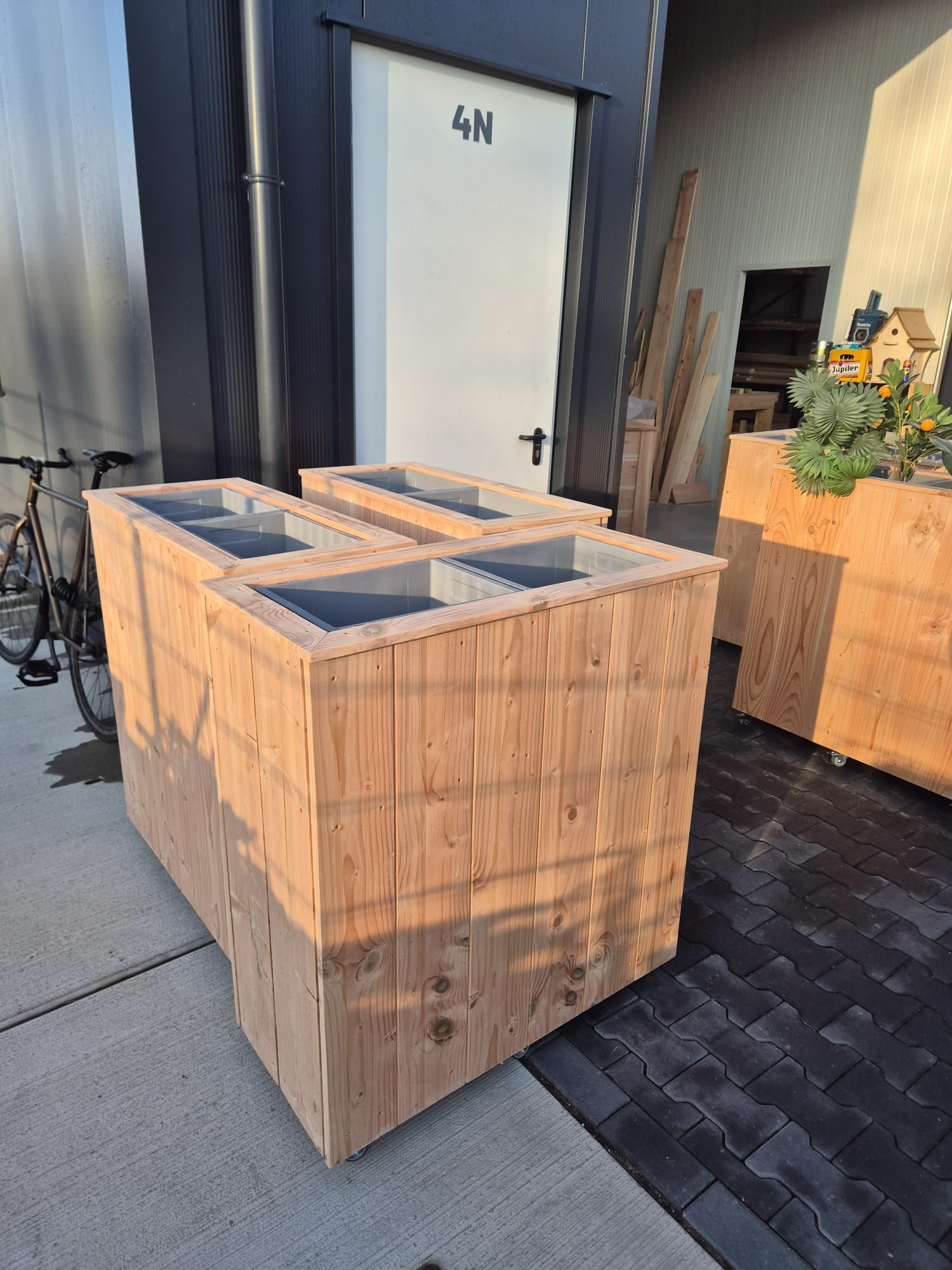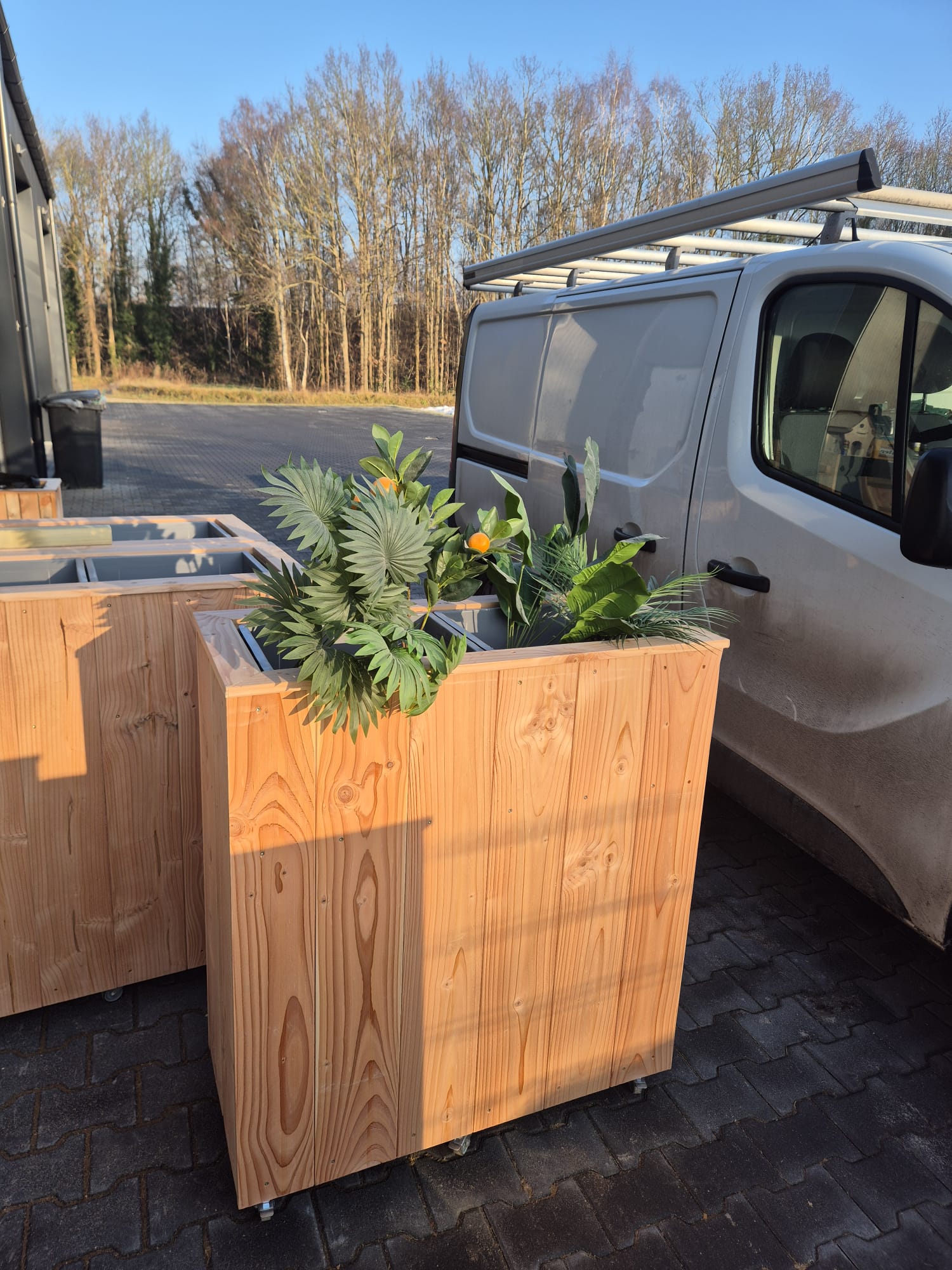 Een verrijdbare plantenbak van geschaafd Douglas hout, voorzien van twee losse inzetbakken en zes zwenkwielen met rem. Praktisch, duurzaam en geschikt voor maatwerk.
