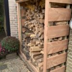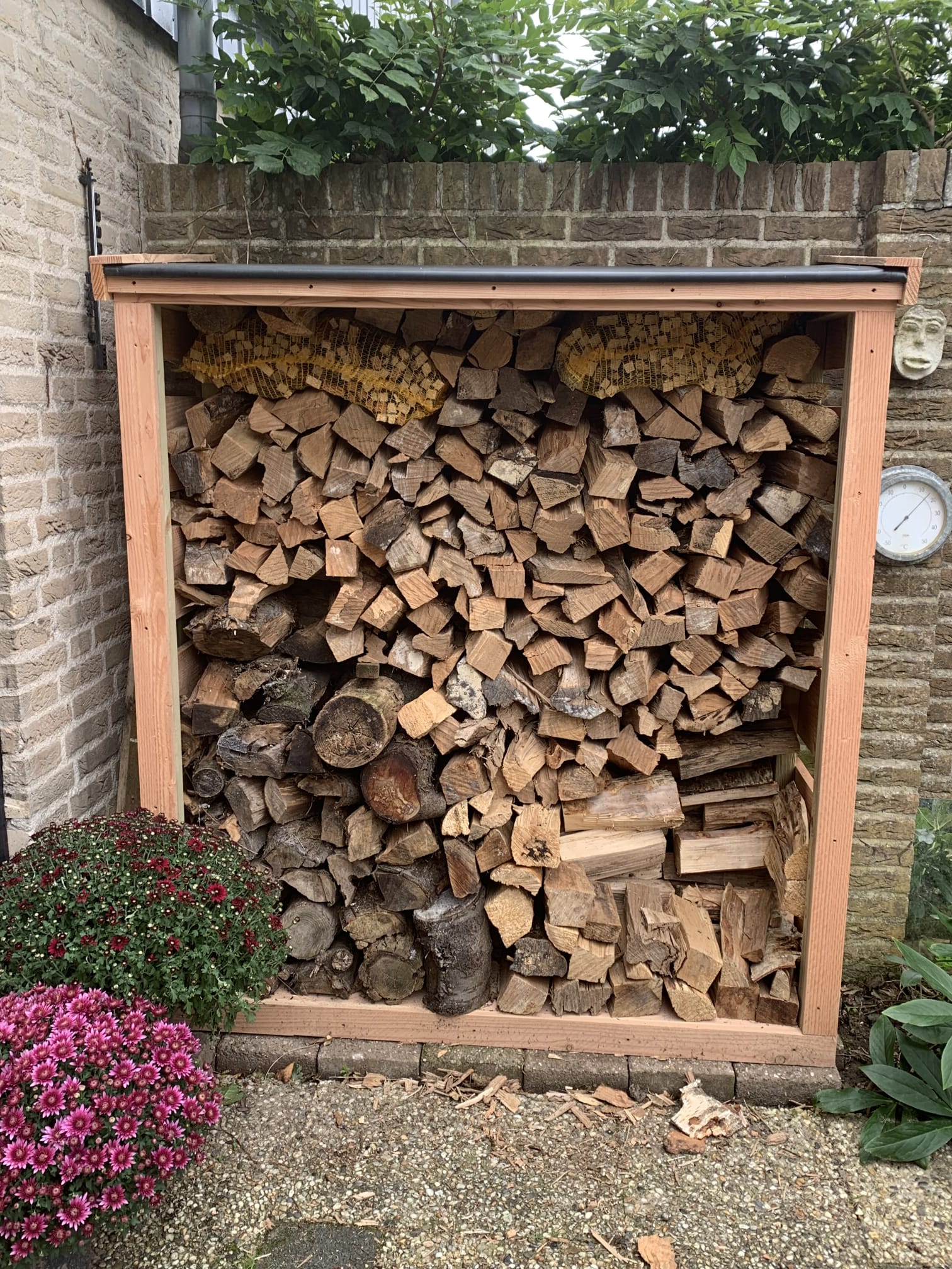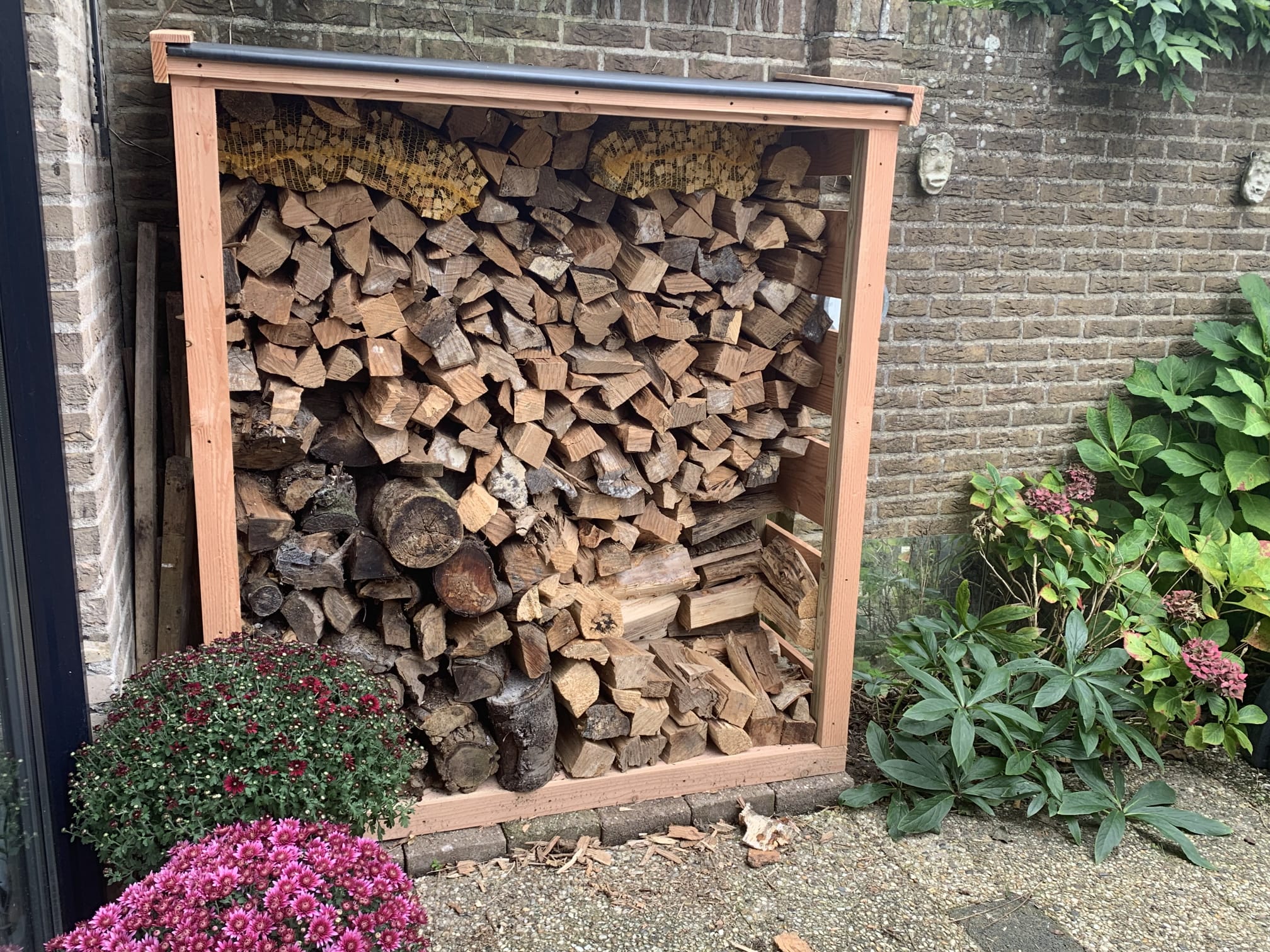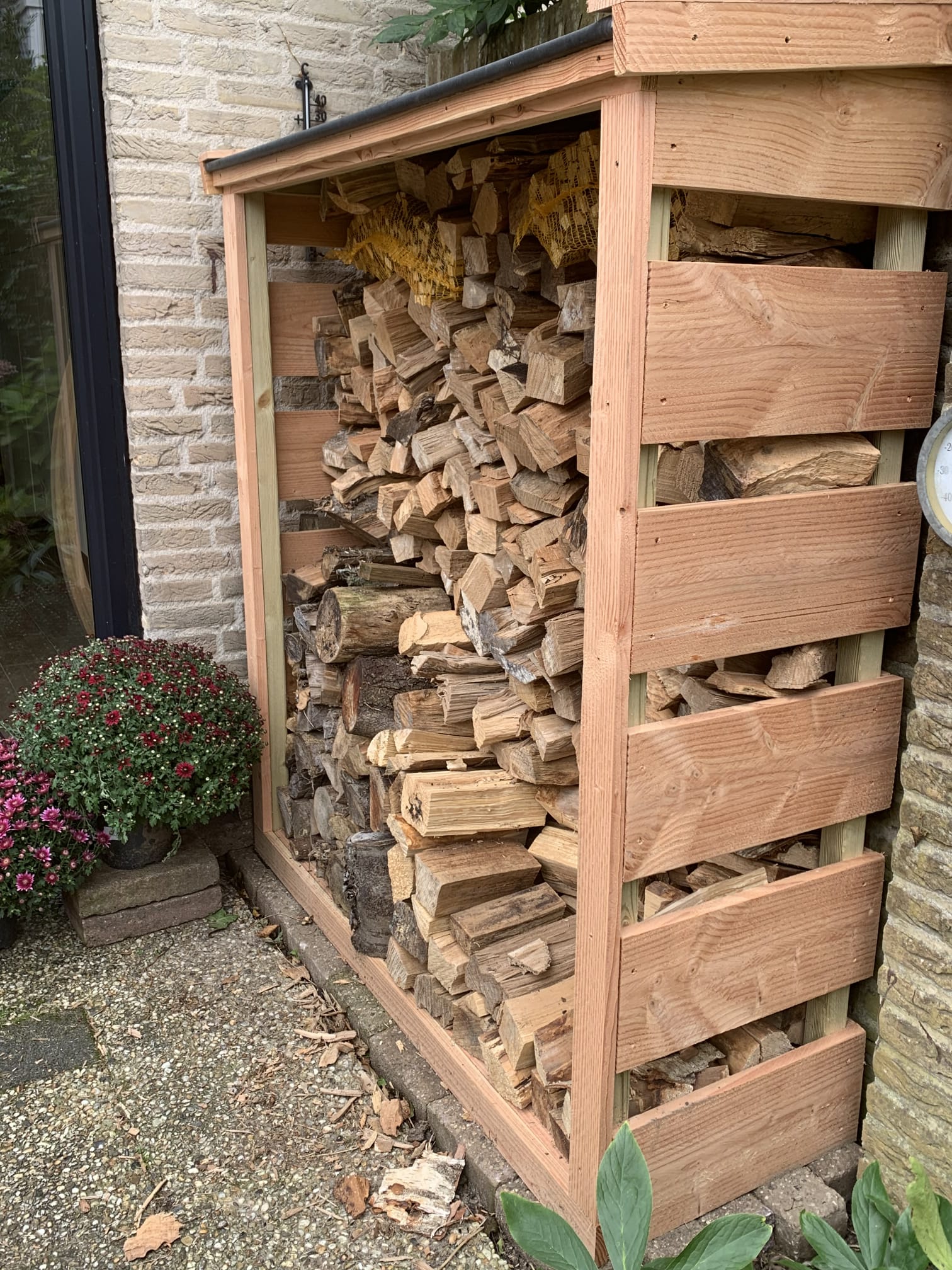 De kast is vervaardigd uit Douglas hout, een houtsoort die bekend staat om zijn sterke en duurzame eigenschappen. Het schuine dak is afgewerkt met een watervaste toplaag, zodat regenwater goed wordt afgevoerd. De open voorzijde en deels open zijkanten zorgen voor een natuurlijke luchtcirculatie, wat het droogproces van het hout bevordert. Dit draagt bij aan een efficiëntere verbranding in je haard of kachel.