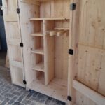 De kast is vervaardigd uit onbewerkt steigerhout: een robuust materiaal dat tegen een stootje kan. Ideaal voor gebruik in een stalomgeving. Het zwarte hang- en sluitwerk is afgewerkt met een duurzame epoxy coating, wat extra bescherming biedt tegen roest en slijtage. Zo blijft de kast lang mooi, ook bij intensief gebruik.