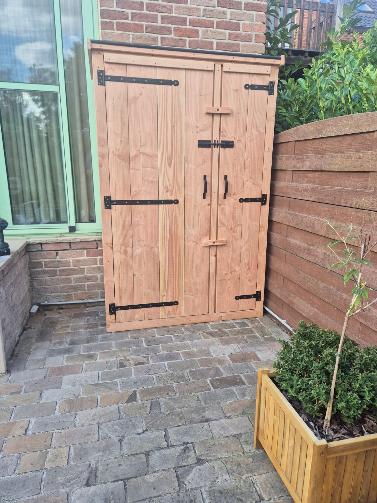 De kast is vervaardigd van hoogwaardig Douglas hout. Deze houtsoort is duurzaam, weerbestendig en past dankzij zijn warme uitstraling perfect in een natuurlijke buitenomgeving. Voor extra contrast en een stoer accent is de kast voorzien van zwart epoxy gecoat hang- en sluitwerk.