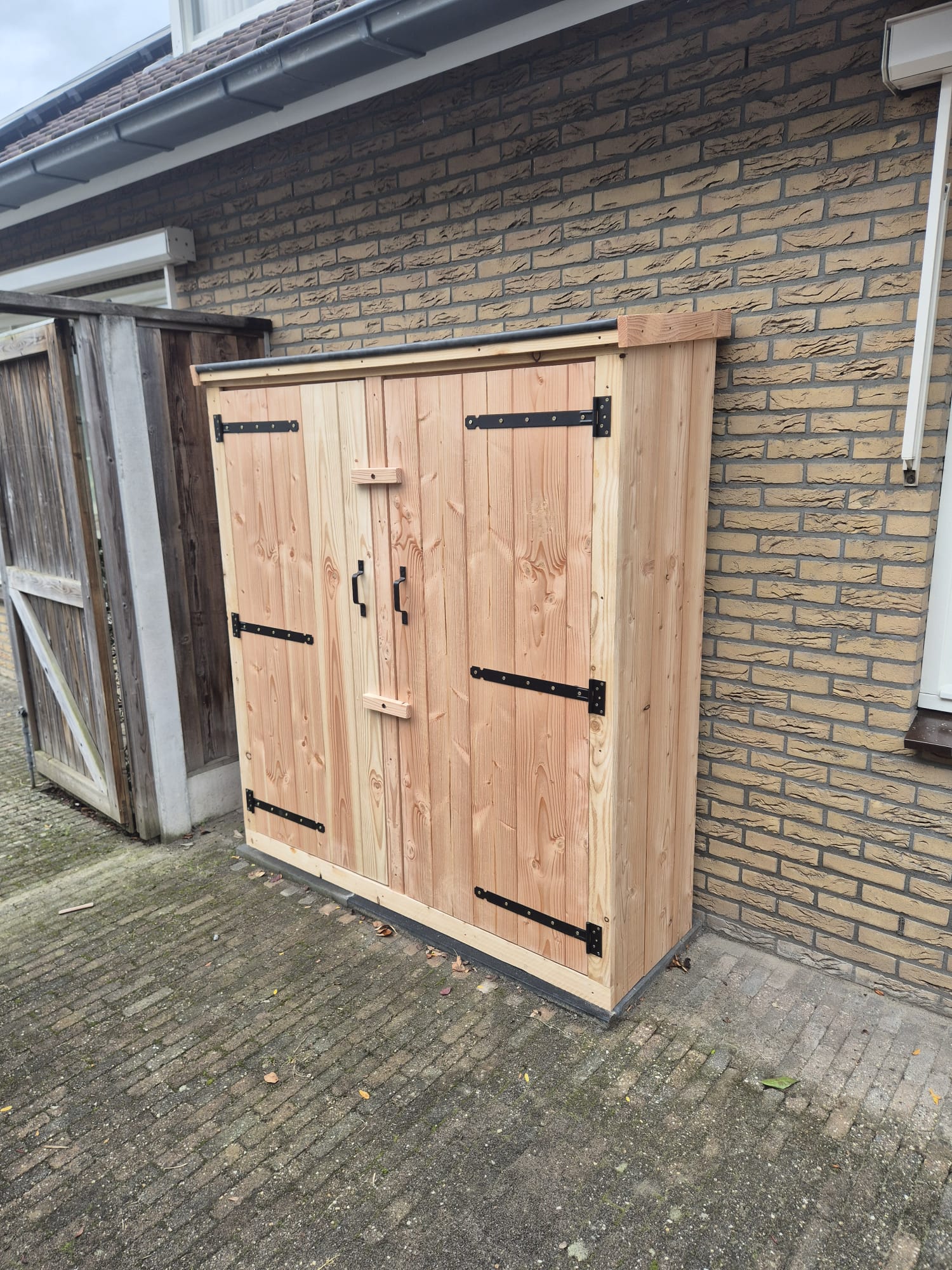 Het dak is voorzien van hoogwaardige EPDM-bedekking, die duurzaam en waterdicht is. Dit betekent dat je je geen zorgen hoeft te maken over lekkages of waterschade aan je waardevolle spullen. Daarnaast komt de kast met een aflopend dakje naar voren, maar dit kunnen wij ook aflopend naar achteren maken mocht je dit optisch mooier vinden.