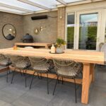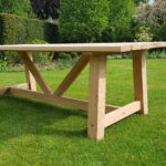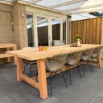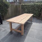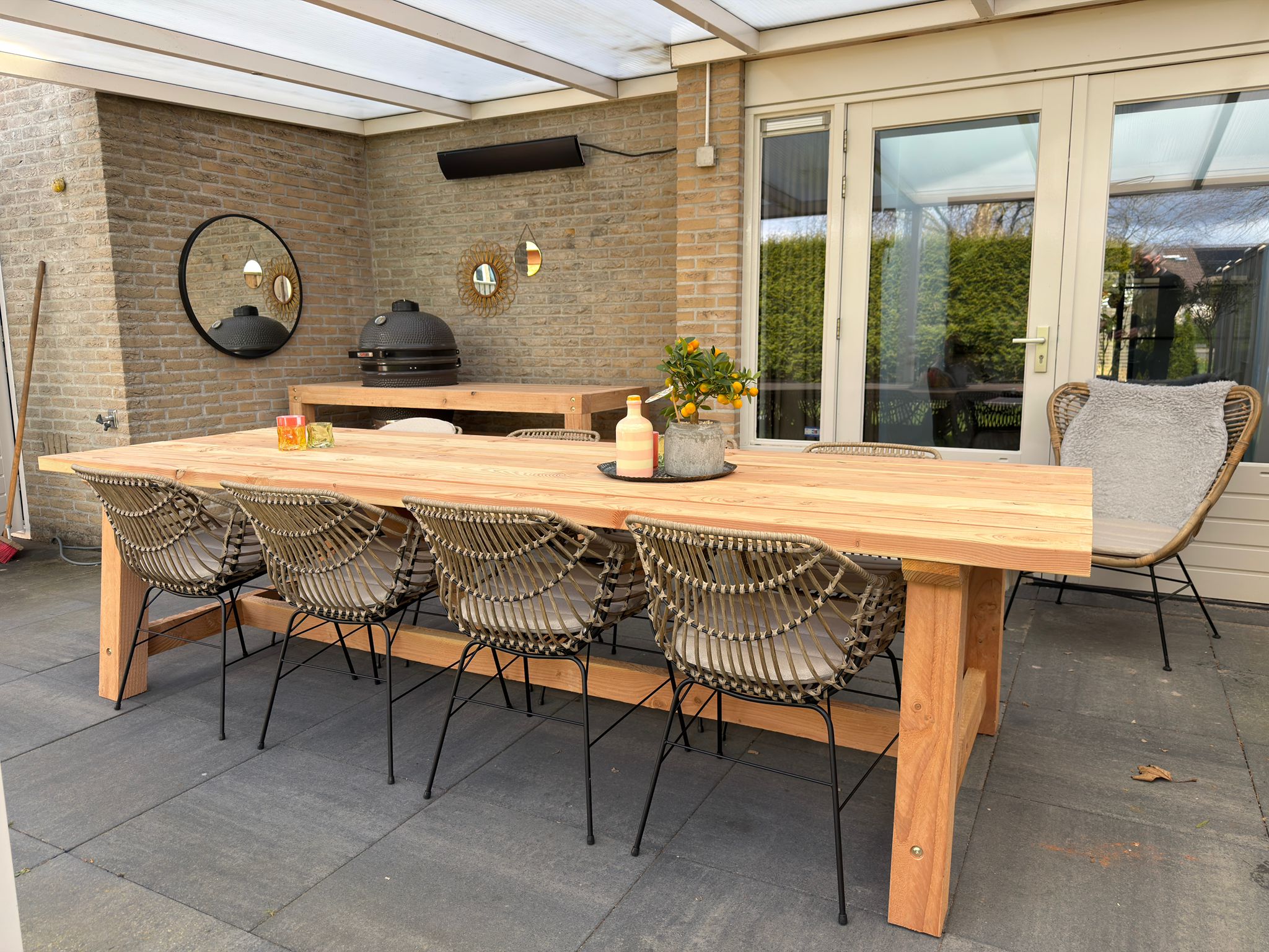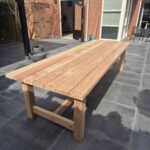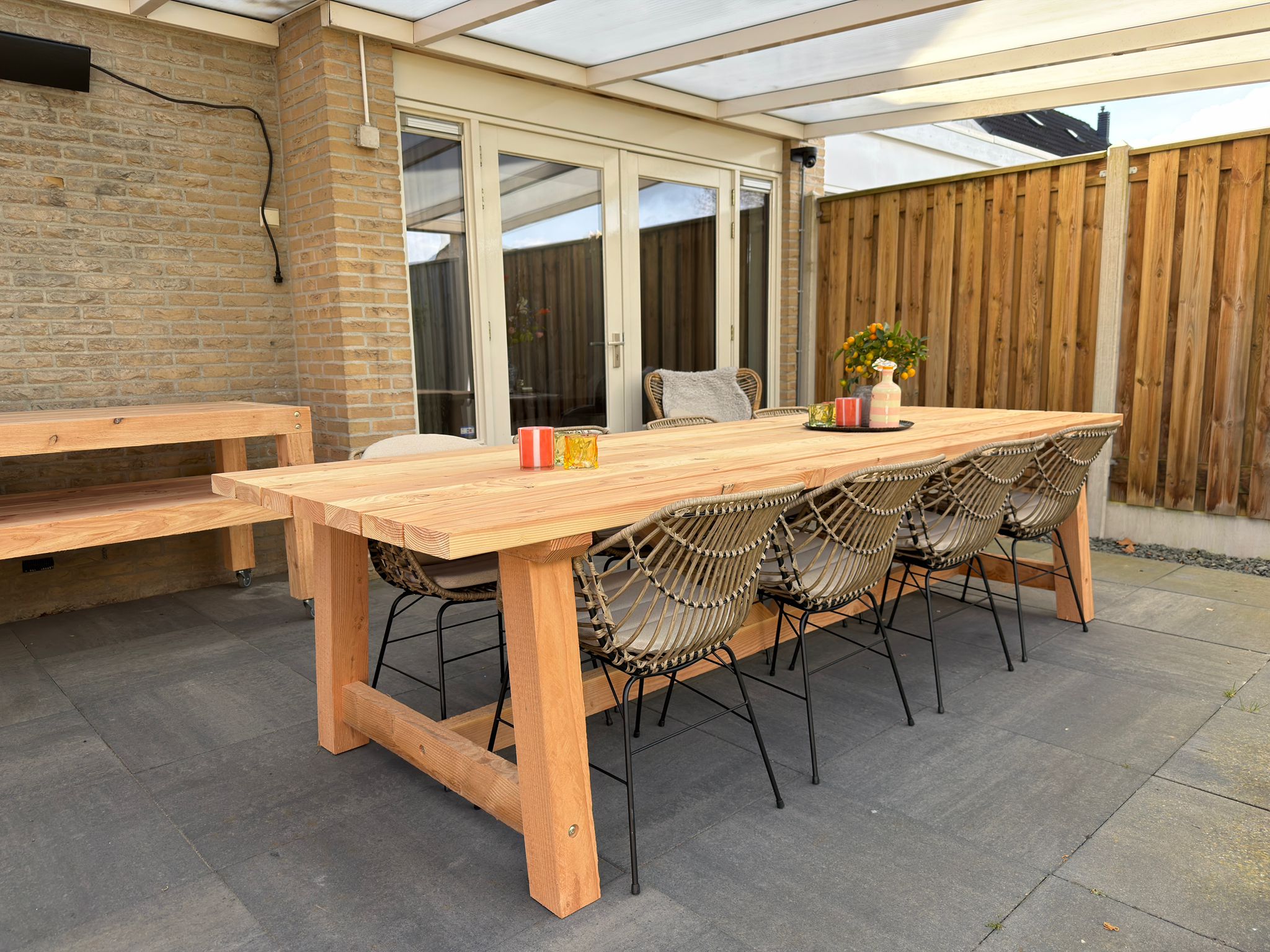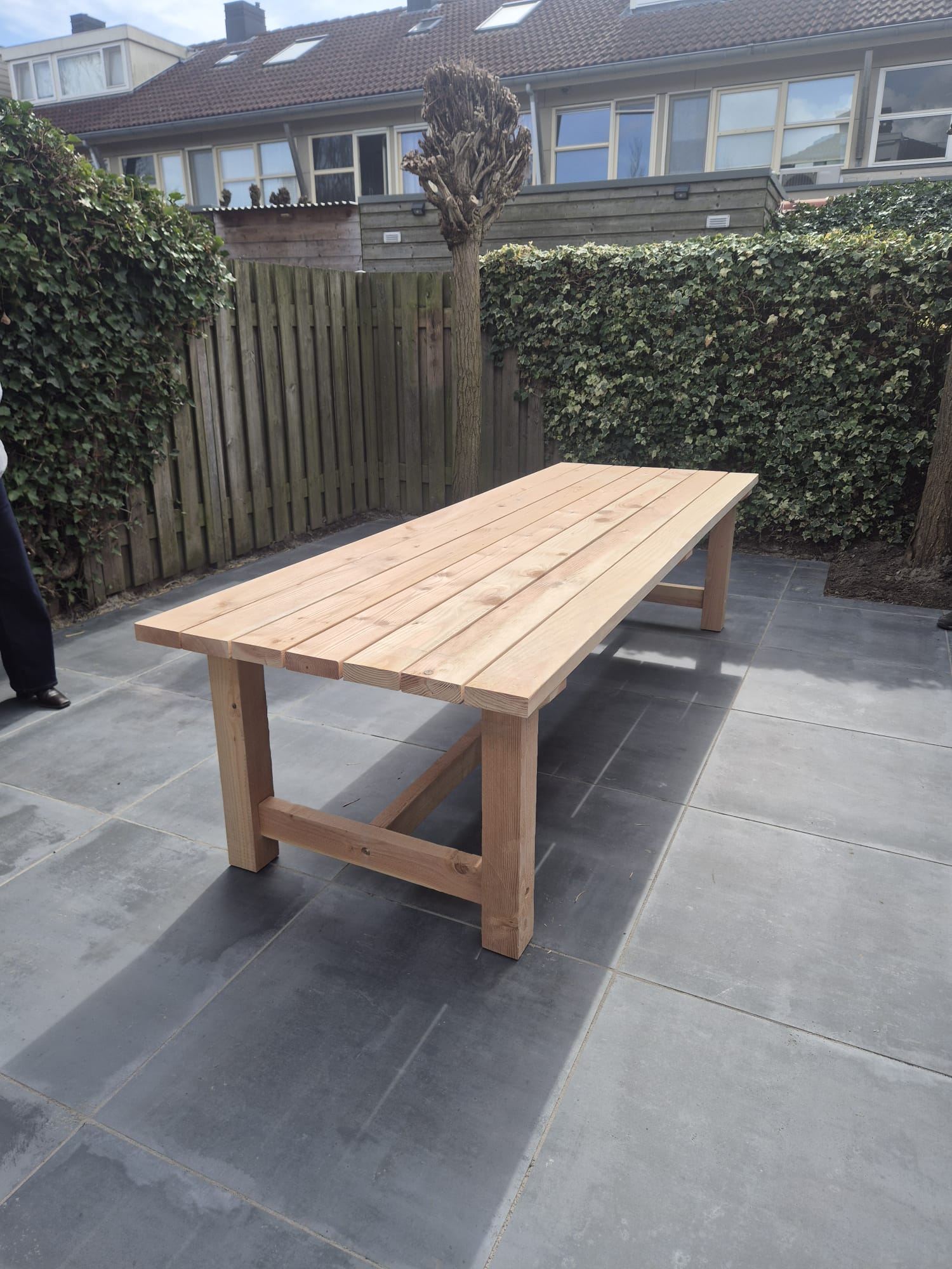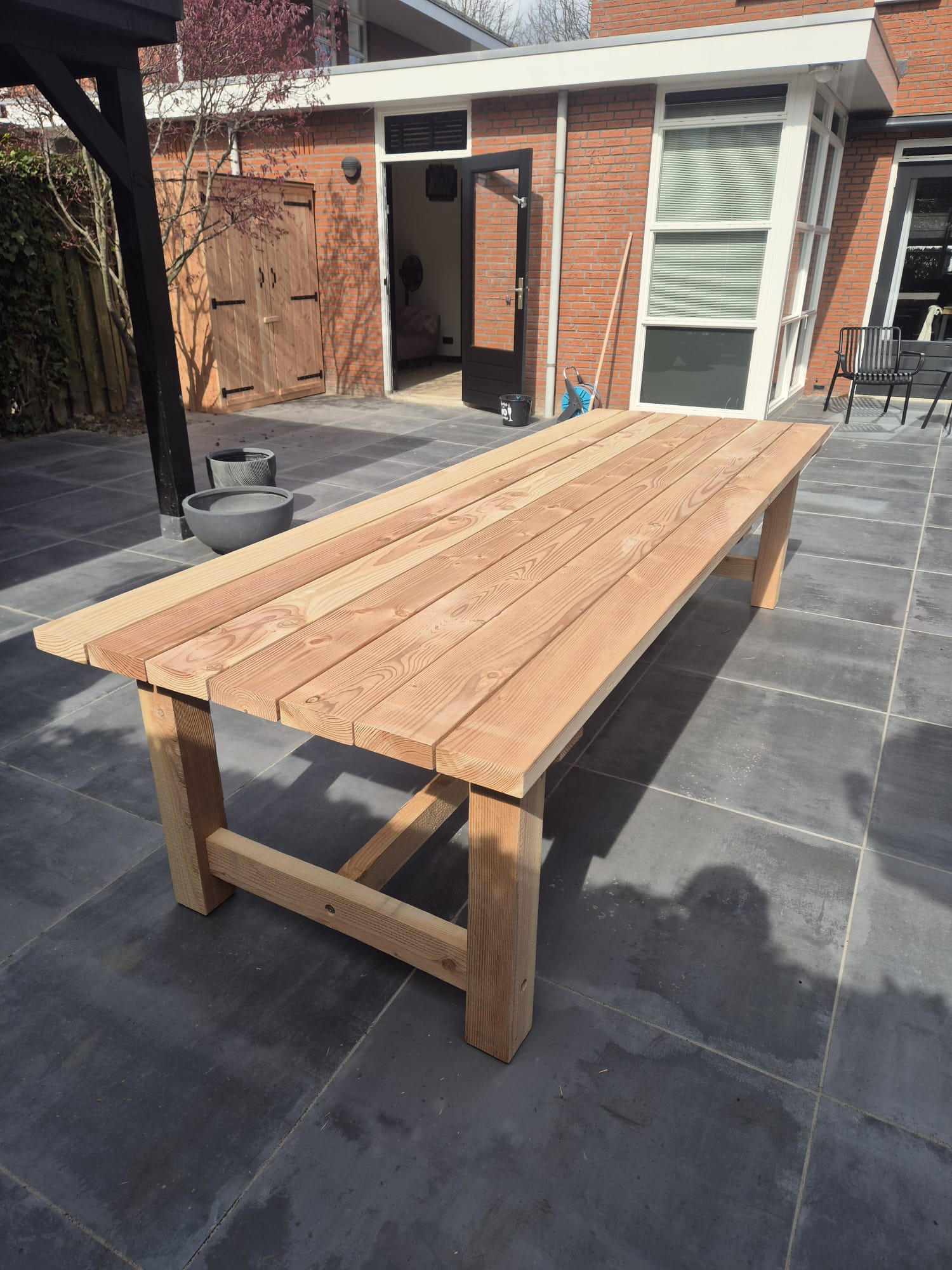 Deze tafel is gebouwd om jarenlang mee te gaan. De constructie wordt volledig geschroefd met zware tellerkopschroeven, wat zorgt voor maximale stevigheid en stabiliteit. Onder de poten worden PVC doppen geplaatst, zodat optrekkend vocht wordt tegengegaan en de levensduur wordt verlengd.