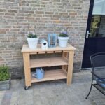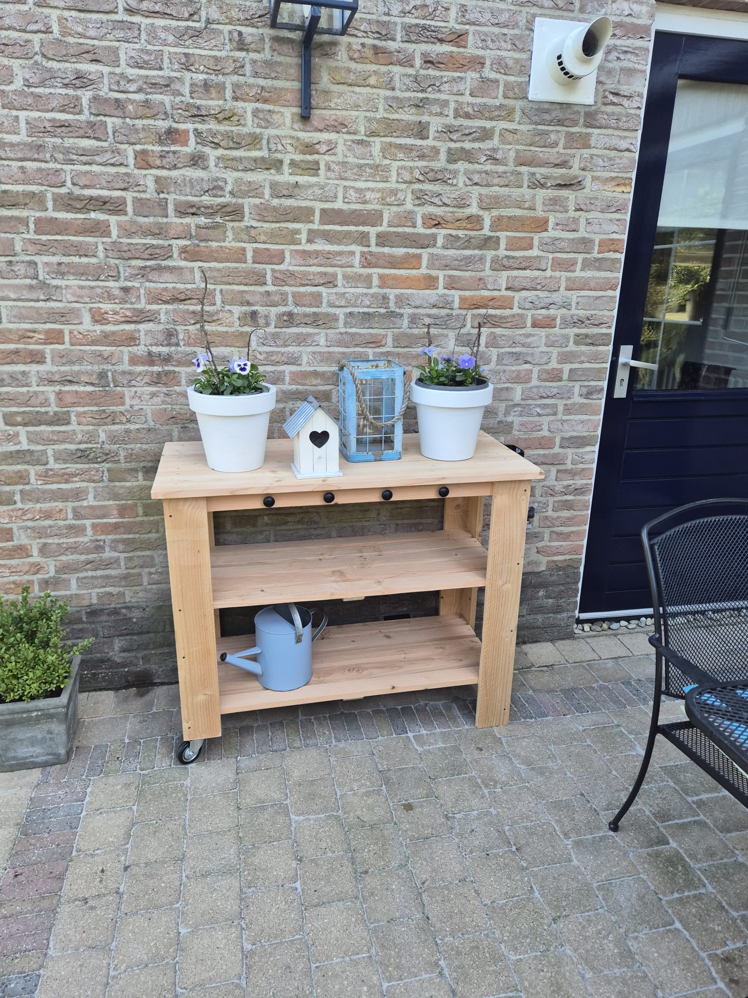 Deze oppottafel is vervaardigd uit hoogwaardig Douglashout, bekend om zijn stevigheid en natuurlijke charme. Het hout is bestand tegen weersinvloeden en uitermate geschikt voor buitengebruik. Voor wie liever een andere stijl zoekt, bieden we ook een vergelijkbare variant in steigerhout.